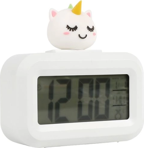 Schattige witte wekker met eenhoornthema die zowel kinderen als liefhebbers van magische accessoires zal verrassen. Dankzij de compacte afmetingen is hij geschikt voor op het nachtkastje of bureau. Werkt op 2 AAA-batterijen (niet inbegrepen). Eenvoudige bediening, lichtgewicht constructie en veilig ontwerp zijn ideaal voor kinderen vanaf 3 jaar.