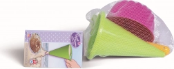 3-delige Androni zandset voor de allerkleinsten, van hoogwaardig plastic, gemaakt in Italië. Bevat een decoratieve mengtrechter voor het mengen van zand en water en het maken van creatieve muffins en zandvormpjes, een vorm in tulbandvorm en een schep voor bolletjes. Licht, veilig en geschikt vanaf 10 maanden.