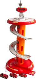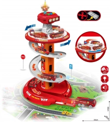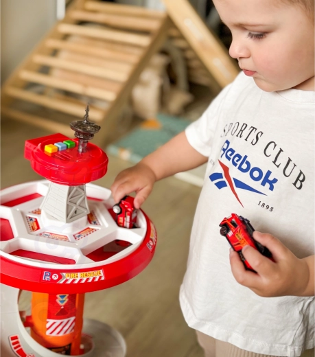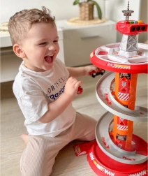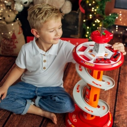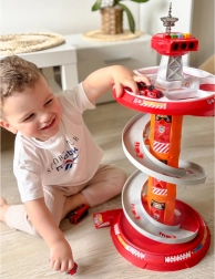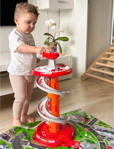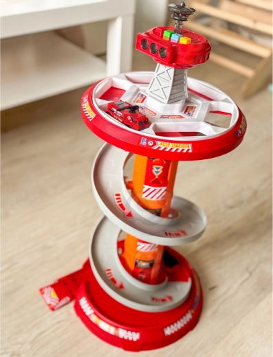 Laat het plezier ronddraaien met de meerlaagse brandweerparkeerplaats van WOOPIE! De stabiele toren met een spiraalvormige ramp maakt een soepele en snelle afdaling van de autootjes mogelijk van de top tot aan de basis. Kinderen trainen fijne motoriek en fantasie wanneer ze uitrukken via de gemarkeerde uitrukroute en volgens de verkeersborden.