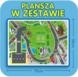 In de set vind je 3 brandweerautootjes, verkeersborden en een wegenmat met gemarkeerde uitrukroute.