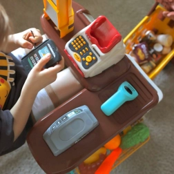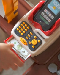 De kassa met uitschuiflade voor geld, kaartlezer en een scanner die licht geeft en geluid maakt, bezorgt kinderen een authentieke winkelervaring.