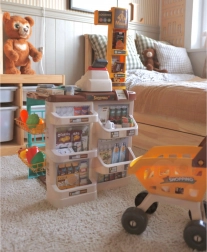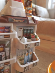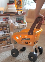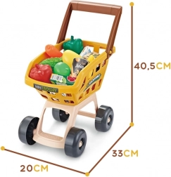 Inclusief mandje/wagentje en een hoeveelheid levensmiddelen zoals fruit, groenten, melk en sap – alles voor compleet winkelspeelplezier.