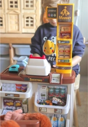 De mechanische weegschaal bootst een echte nauwkeurig na en de schikking met prijskaartjes helpt kinderen sorteren, rangschikken en waarde leren kennen.