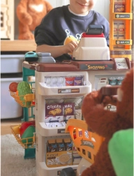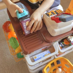 Met de Woopie supermarktset ontdekken kinderen de wereld van boodschappen doen en de basis van tellen. Realistische elementen zoals een scanner met licht en geluid, een kassa met uitschuiflade en een mechanische weegschaal bootsen een echte winkel overtuigend na. De stabiele toonbank met hang- en legplekken voor producten en duidelijke prijskaartjes stimuleert zelfstandigheid en organisatie.