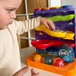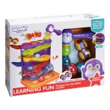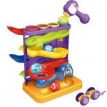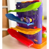 Dankzij thematische kogels kun je spelenderwijs tellen en het alfabet oefenen. Kinderen verbeteren hun coördinatie, gripkracht en begrip van oorzaak en gevolg – de kogel of het autootje vertrekt van boven en rolt helemaal naar beneden over de golvende banen.