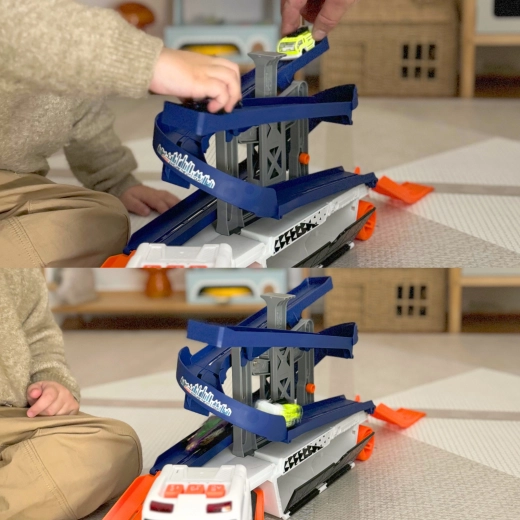 De meerlaagse baan met helling maakt parkeren, snelle afdalingen en sprongen mogelijk. Perfect voor de ontwikkeling van motoriek en competitiedrang.