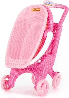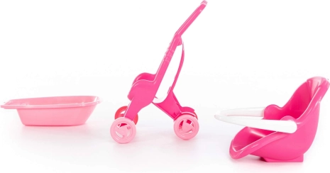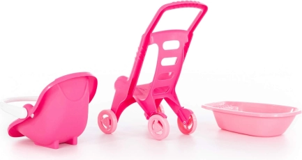 De wagen bestaat uit twee delen: een onderstel en een draagzitje. Daarnaast vindt u in de set een badje om de pop te “baden”.