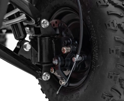 Een dubbele voorvorkdemper en een centrale achterdemper zorgen voor zekerheid op oneffenheden. Het robuuste frame met versterkte achterbrug kan ook zwaarder gebruik aan.