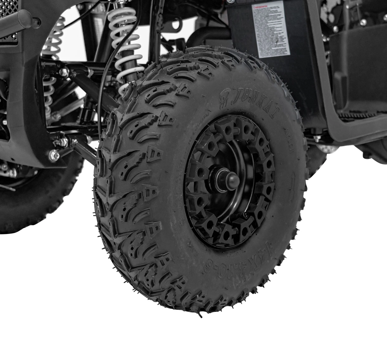 Opblaasbare banden met een agressief loopvlak verhogen de grip in het terrein en de stabiliteit in bochten, zodat het kind met meer vertrouwen kan rijden.