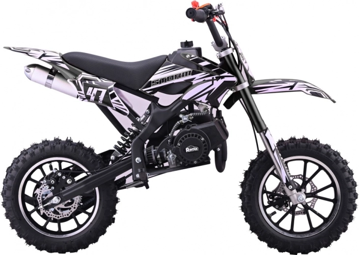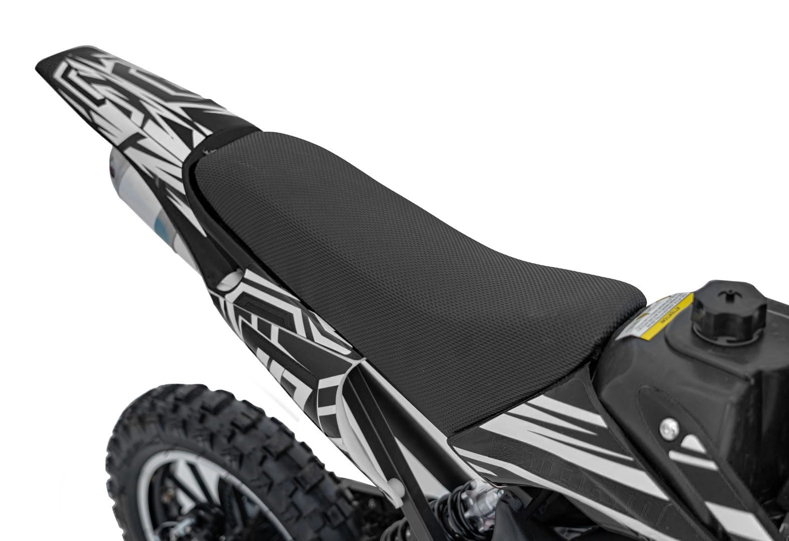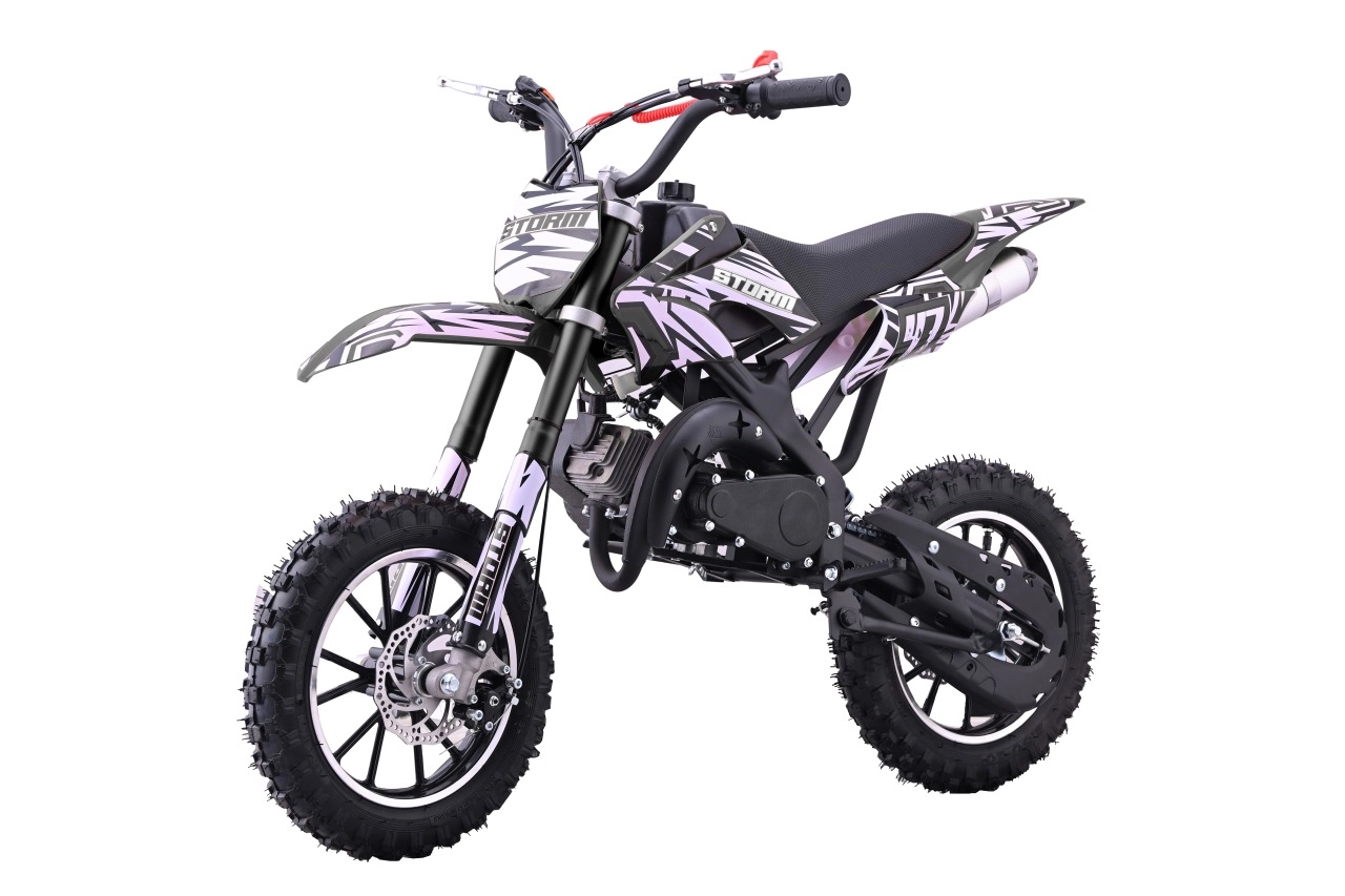 De mini dirt bike STORM is een uitstekende keuze voor de eerste stappen in de offroad-wereld. Licht en wendbaar met een poedergecoat frame dat oneffenheden aankan en zekerheid biedt in bochten. De tweetakt, luchtgekoelde eencilinder van 49 cm³ start met een handstarter en zorgt voor vlotte acceleratie op weilanden en bospaden.