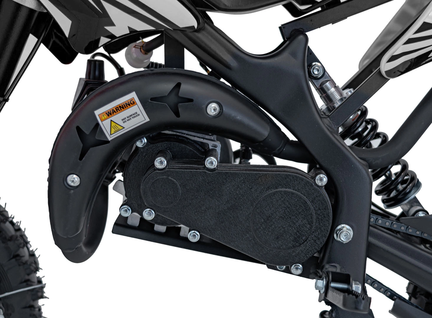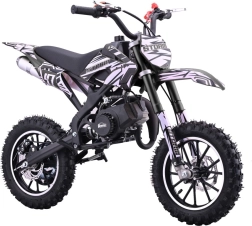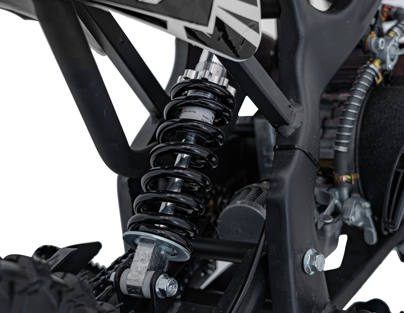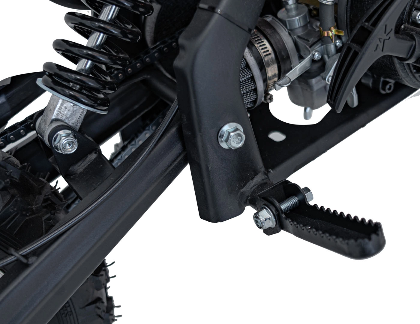 De mini dirt bike STORM is een uitstekende keuze voor de eerste stappen in de offroad-wereld. Licht en wendbaar met een poedergecoat frame dat oneffenheden aankan en zekerheid biedt in bochten. De tweetakt, luchtgekoelde eencilinder van 49 cm³ start met een handstarter en zorgt voor vlotte acceleratie op weilanden en bospaden.