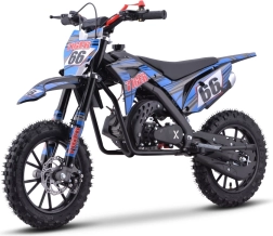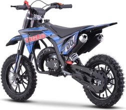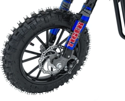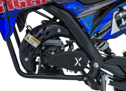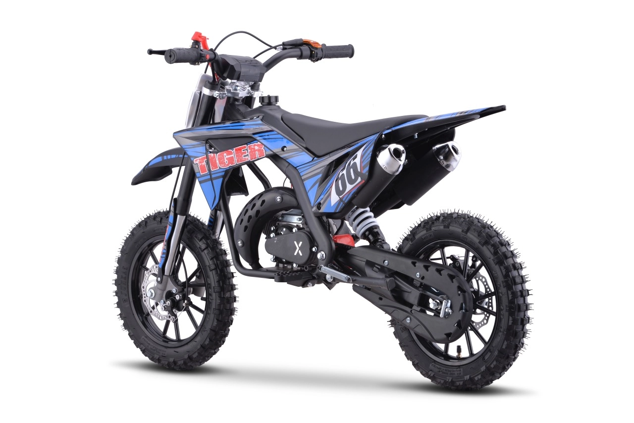 De mini motor TIGER met 49 cc is een uitstekende keuze voor recreatief rijden in licht terrein. Hij biedt een robuuste constructie met een poedergecoat frame, versterkte swingarm en flexibel kunststof bodywork. De luchtgekoelde tweetakt eencilinder brengt het vermogen via een ketting naar het achterwiel, terwijl de schijfremmen zorgen voor zeker stoppen.