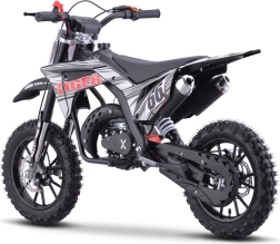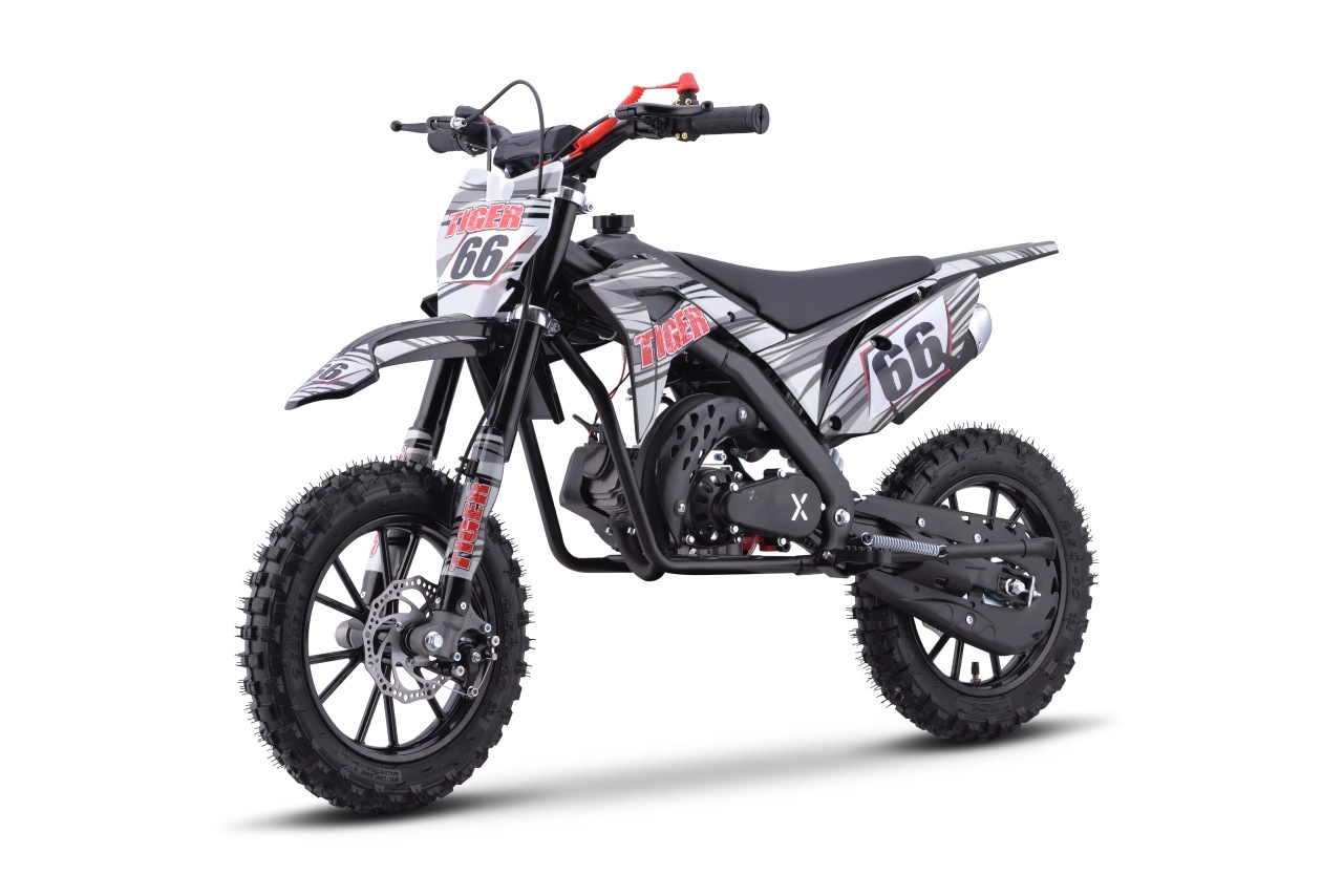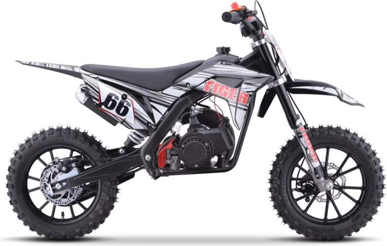 Het model TIGER is een ideale keuze voor beginnende rijders en recreatief gebruik. De lichte en duurzame constructie met hoogwaardige, flexibele kunststofdelen, de krachtige tweecilinder 49 cm³ luchtgekoelde motor en de kettingaandrijving vormen samen een betrouwbare set-up voor dynamisch rijden. De kegelvormige luchtfilter verbetert de ademhaling van de motor en zorgt voor een soepele loop.