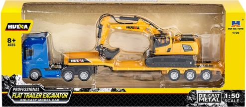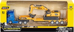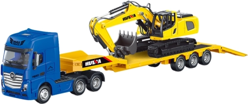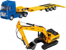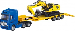 De trekker met laagbedoplegger en graafmachine maakt echt transport van zwaar materieel na – ideaal voor creatief spel en voor in vitrines van verzamelaars.