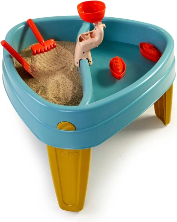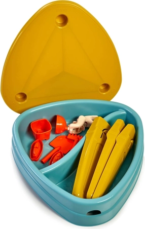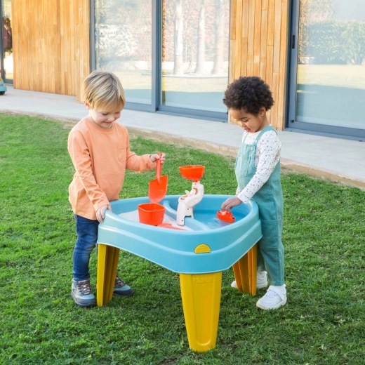 De constructie met stevigere poten zorgt voor hoge stabiliteit, terwijl afgeronde randen veilig gebruik ook voor de allerkleinsten mogelijk maken. Hoogwaardig kunststof met UV-bescherming houdt de kleuren lang mooi. In de verpakking vind je bovendien 5 handige accessoires voor graven, scheppen en waterexperimenten.