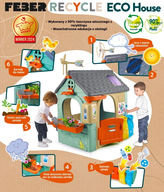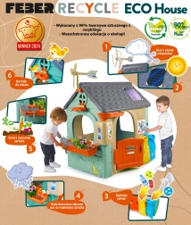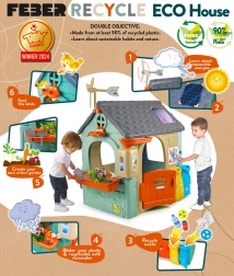 Ontdek de speelse wereld van leren met het huisje FEber Recycle Eco – een kleurrijk kinderhuisje van 90% gerecycled plastic, bekroond met de ToyAward 2024. Kinderen zullen afval scheiden, planten zaaien en spelenderwijs kennismaken met groene energie dankzij de mini-windturbine en het zonnepaneel. Duurzame constructie met Anti‑UV-bescherming, eenvoudige montage en tal van interactieve elementen voor slim en veilig buitenspelen.