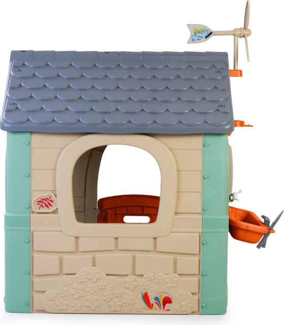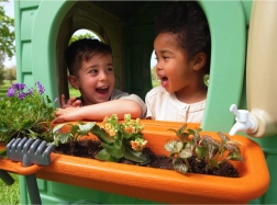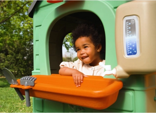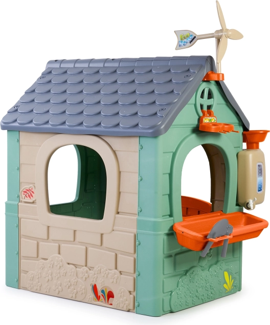 De ingebouwde plantenbak, kraantje en tuingereedschap stimuleren het zaaien van zaadjes, water geven en het observeren van plantengroei. Er is ook een praktisch vogelvoederhuisje.