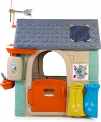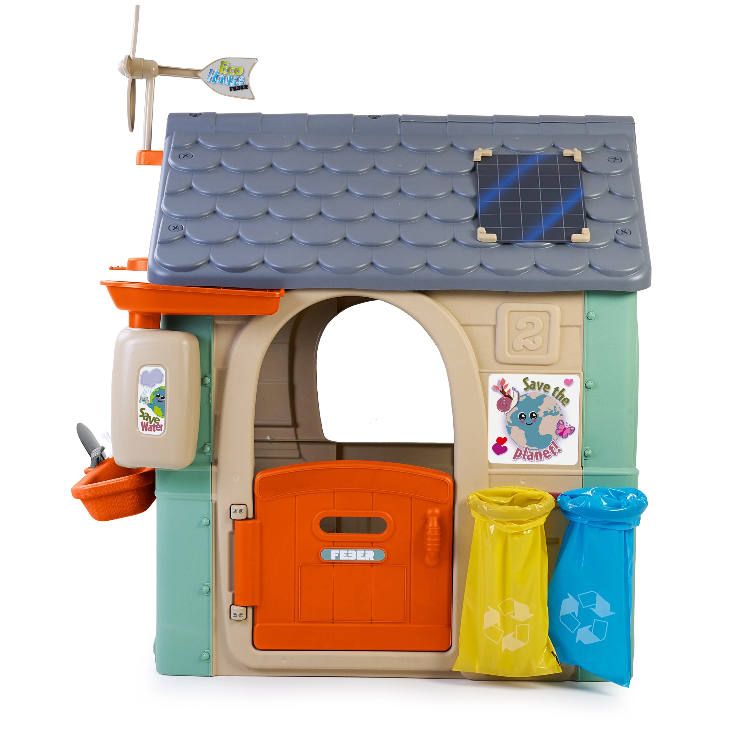 Het FEber Recycle Eco huisje brengt realistische ecologische speelervaringen naar de tuin of het terras. Inclusief recyclebakken (geel en blauw), een plantenbak voor de eerste kweekpogingen, tuingereedschap, een vogelvoederhuisje en decoratieve elementen die milieueducatie ondersteunen. Dankzij de windturbine en de imitatie van een zonnepaneel begrijpen kinderen op speelachtige wijze de principes van duurzame energie.