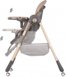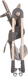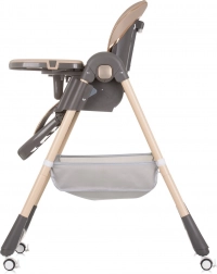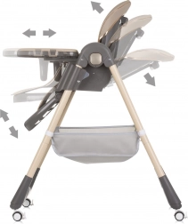 Dankzij 4 wieltjes verplaats je de stoel moeiteloos van de keuken naar de woonkamer. Na gebruik klap je hem tot compacte afmetingen in; de mand onder de zitting biedt plek voor speelgoed en accessoires.