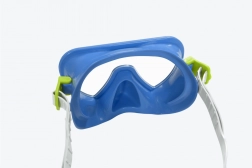 Het blauwe duikmasker is uitgerust met UV-beschermende lenzen en een verstelbare siliconenband die comfort en veiligheid onder water biedt.