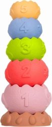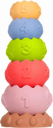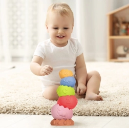 De pastelkleurige onderdelen zijn gemakkelijk vast te pakken en stapelen stabiel tot een hoge toren. Kinderen oefenen oog-handcoördinatie en geduld bij elke gebouwde piramide.
