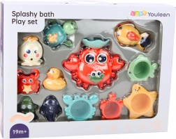 Maak het badderen leuker voor je kinderen met een kleurrijke badset met een krab, visjes, een schildpadje, een walvis en andere zeediertjes. De speeltjes drijven op het water, kunnen water spuiten en dankzij gietopeningen stimuleren ze gevoel voor water, plezier en leren. Het zachte en veilige materiaal ligt prettig in de hand en past perfect in kleine kinderhandjes.
