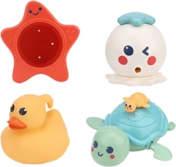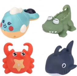 De krab, visjes, het schildpadje en de walvis drijven op het wateroppervlak en spuiten water wanneer je erin knijpt – plezier gegarandeerd bij elk badmoment.