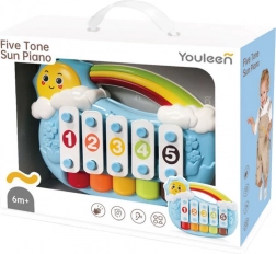 Een schattig pianootje in de vorm van een lachend zonnetje biedt 5 tonen die kinderen eenvoudig laten klinken met een lichte tik. Vanaf 6 maanden ondersteunt het de ontwikkeling van de zintuigen, fijne motoriek en ritmegevoel. Inclusief 3 bladen met melodieën, de kleurrijke uitvoering trekt de aandacht en de veilige afwerking met afgeronde randen is ideaal voor de allerkleinsten. Een praktisch draaghandvat maakt meenemen thuis en onderweg gemakkelijk.