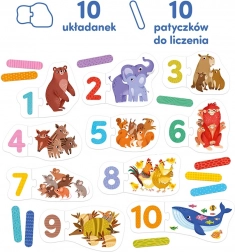 Puzzelen ondersteunt de ontwikkeling van de woordenschat, fantasie en visuele waarneming. Kinderen kunnen de dieren benoemen, verhaaltjes bedenken en cijfers in hun omgeving zoeken. De set is een geweldige start voor het leren tellen tot 10 en de eerste pogingen tot het schrijven van cijfers.