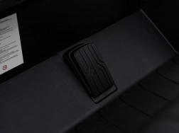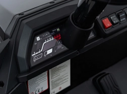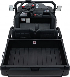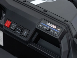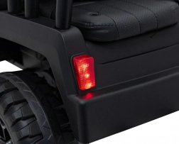 Het interieur verrast met twee afzonderlijke stoelen van eco-leer met veiligheidsgordels, een functioneel audiopaneel (FM-radio, MP3, Bluetooth, USB) en bedieningsknoppen op het stuur. Voor extra ouderlijke controle is er een 2,4 GHz afstandsbediening met drie snelheden en een directe STOP-knop. De grote achterkoffer met neerklapbare klep neemt alles mee wat je nodig hebt voor je uitstapjes.