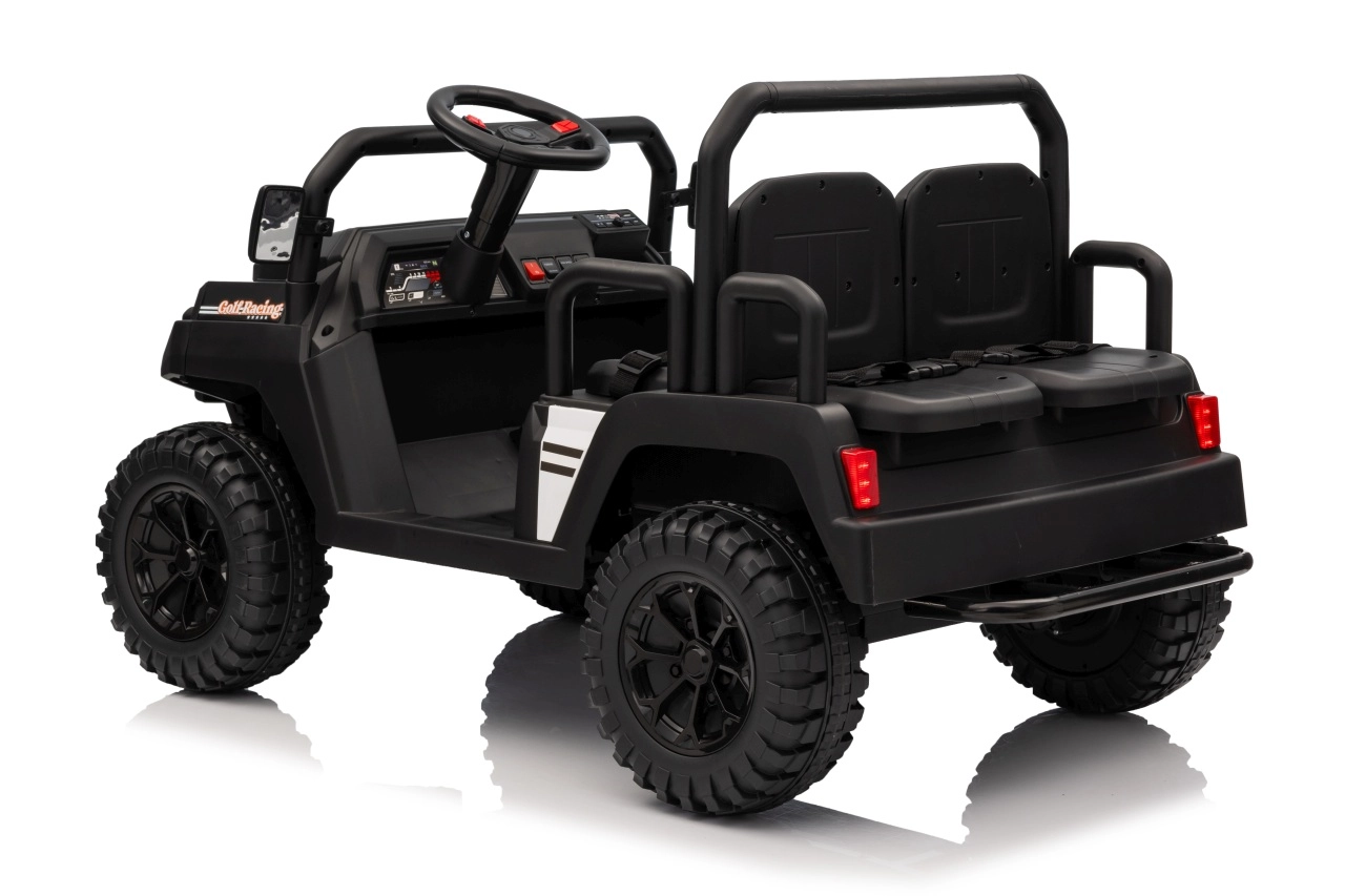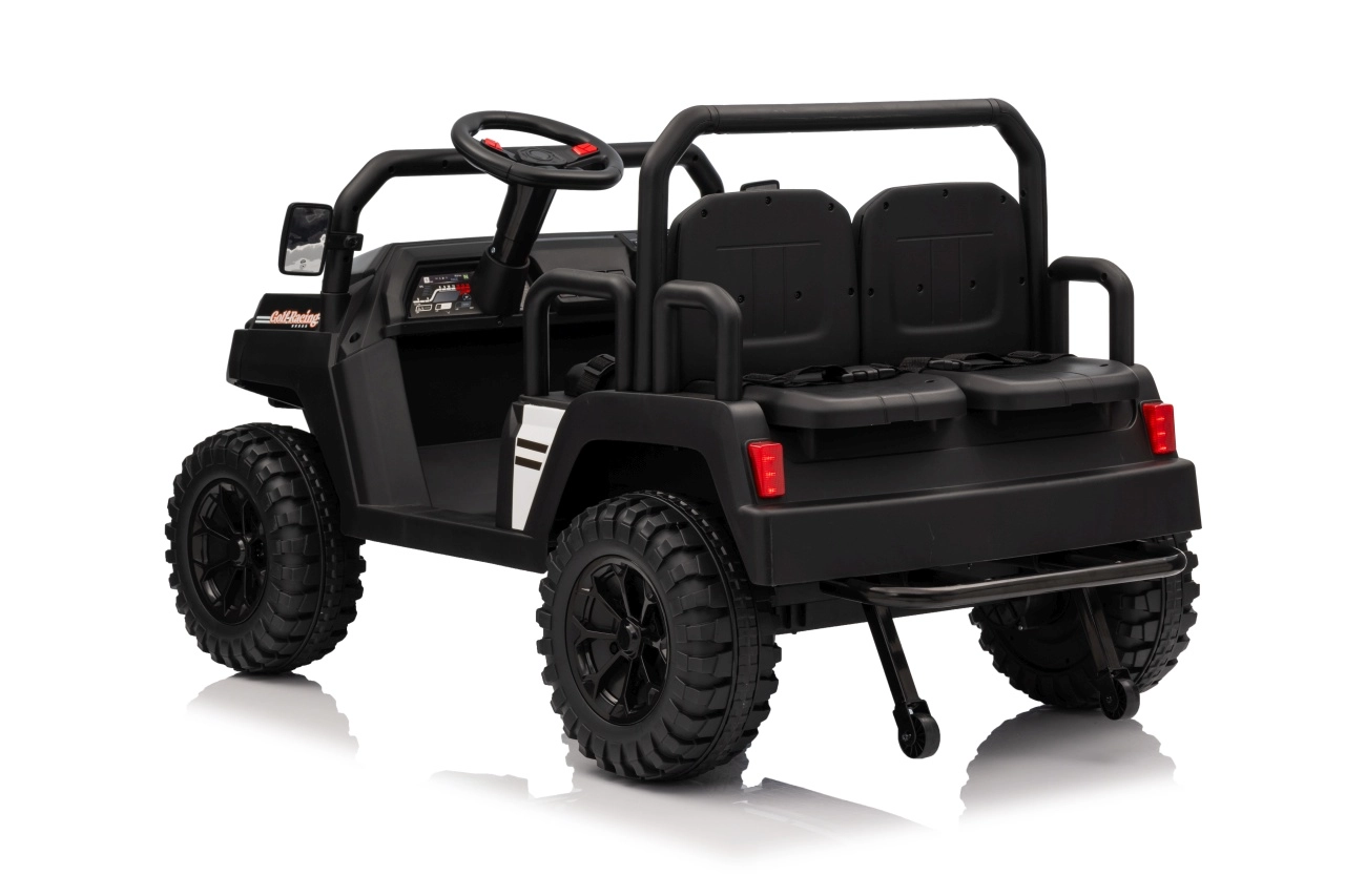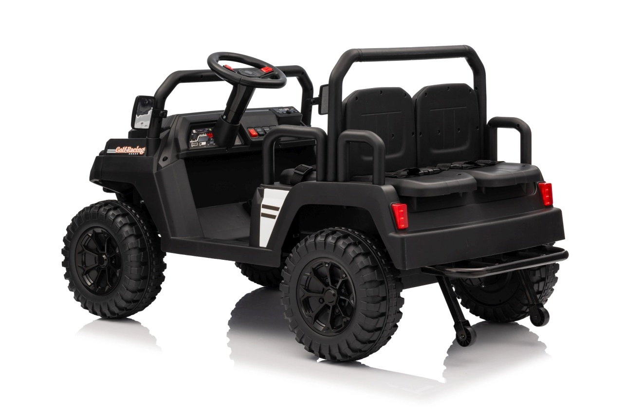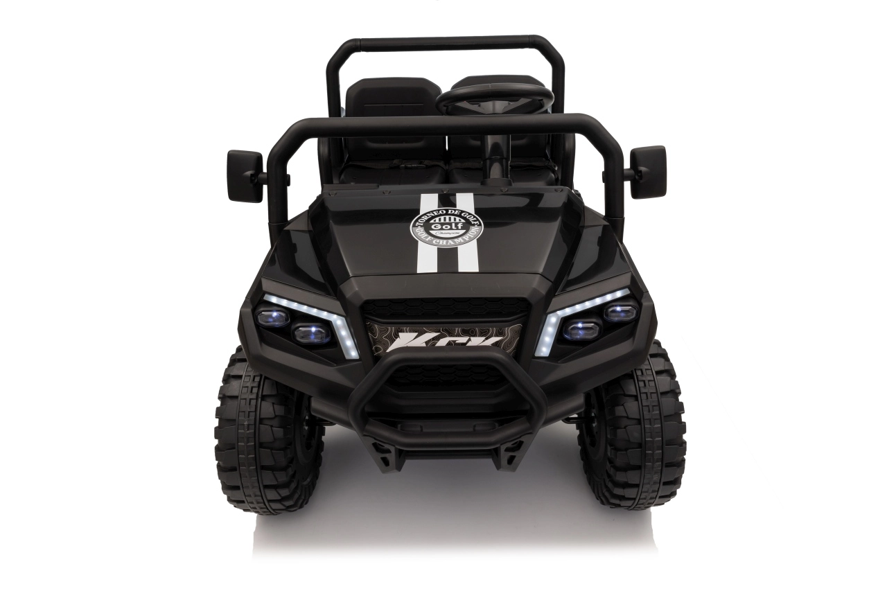 De vierzits elektrische buggy Champion in elegante zwarte kleur is gemaakt voor gezamenlijke avonturen. Dankzij de 2×200 W aandrijving en de 24 V / 9 Ah accu biedt hij voldoende kracht, ook buiten verharde wegen. De grote EVA wielen 29×12 cm en voor- en achtervering zorgen voor comfortabel en stabiel rijden.