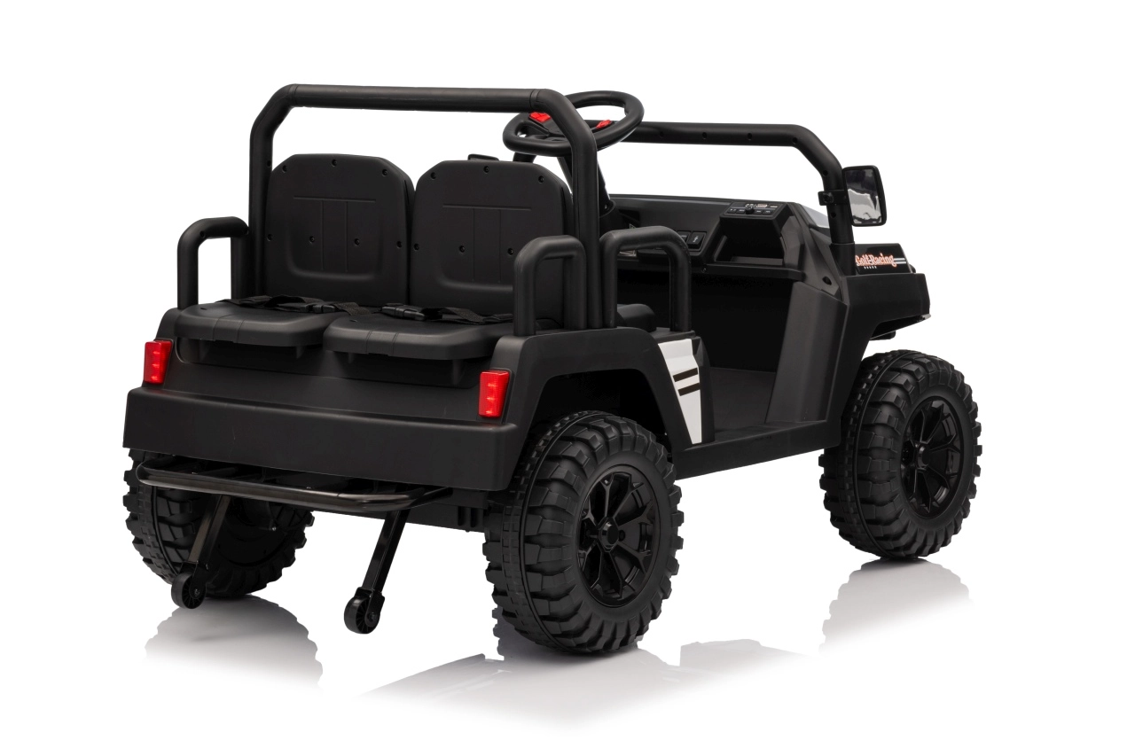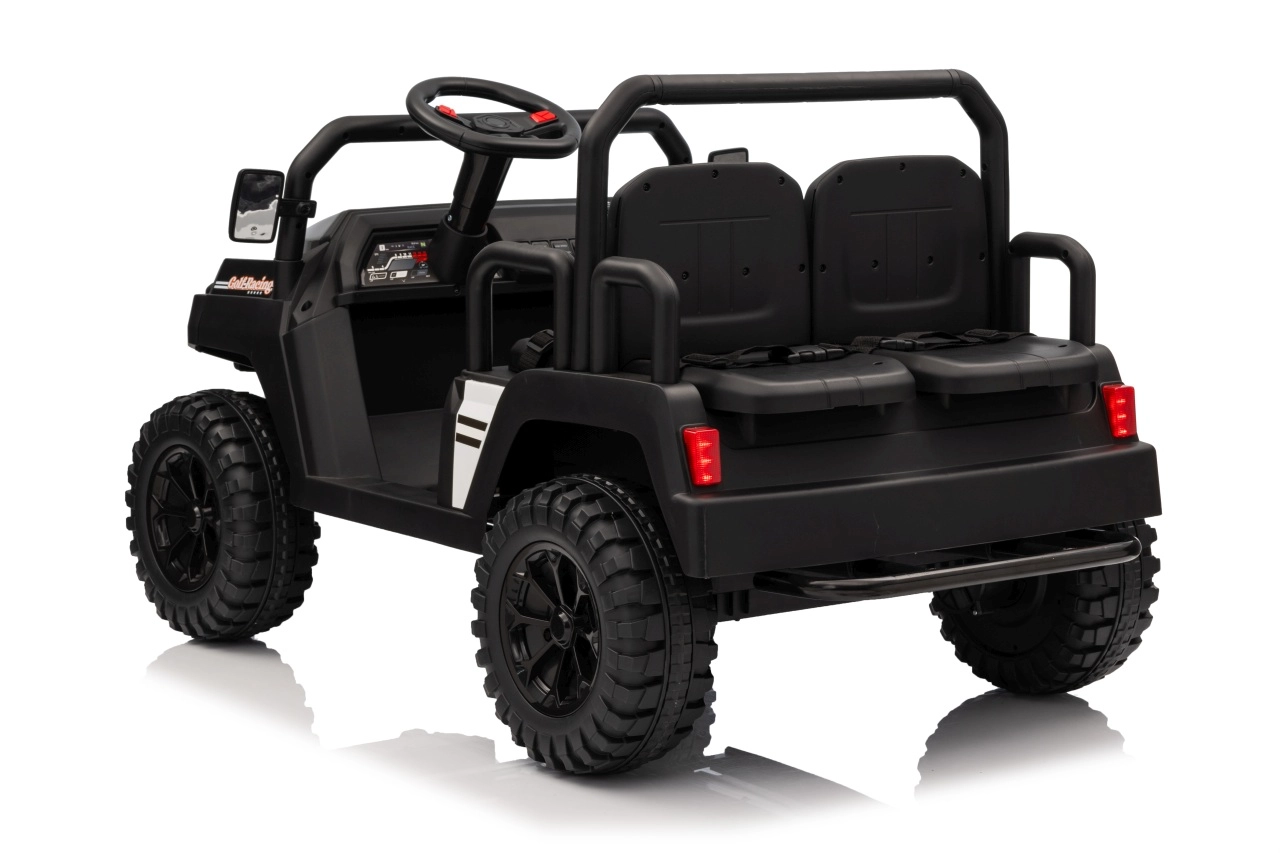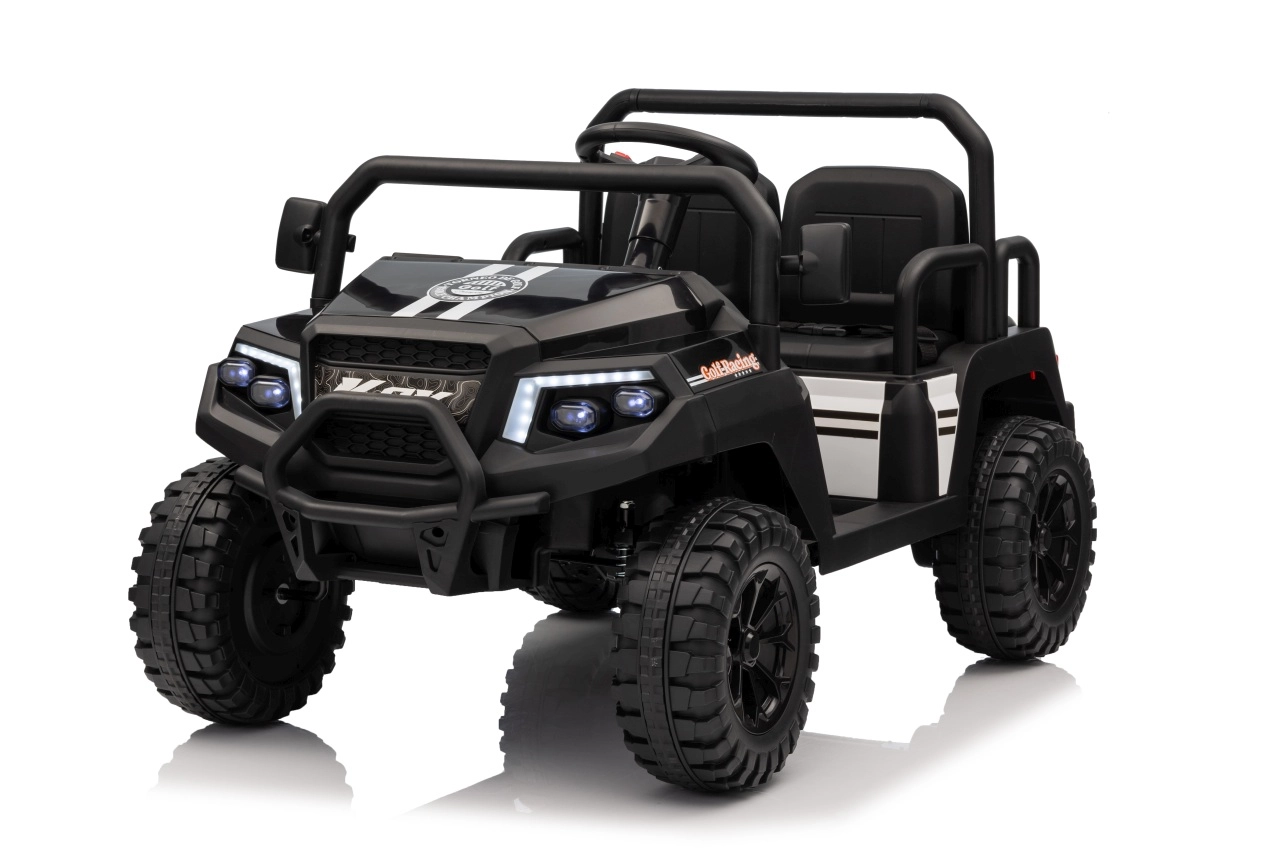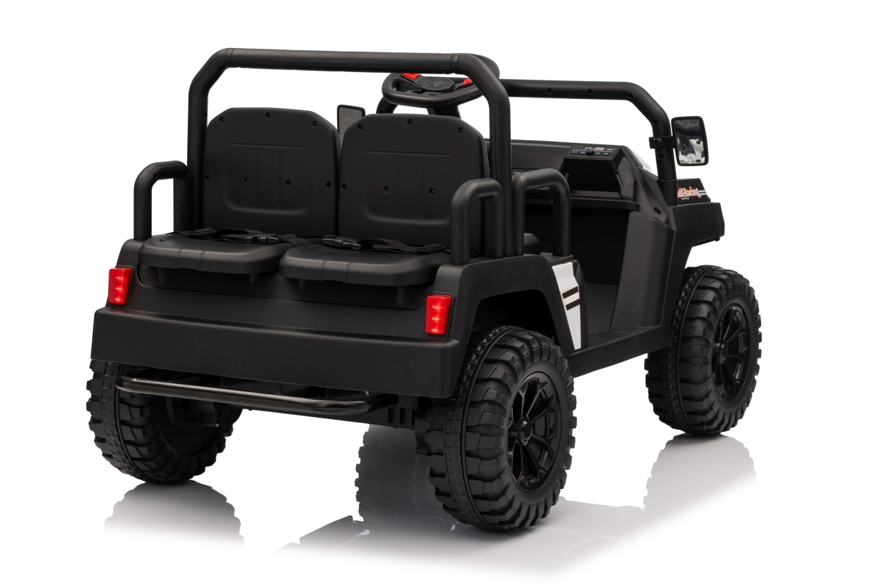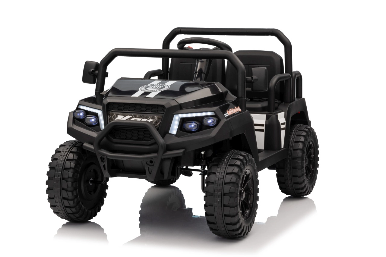 De vierzits elektrische buggy Champion in elegante zwarte kleur is gemaakt voor gezamenlijke avonturen. Dankzij de 2×200 W aandrijving en de 24 V / 9 Ah accu biedt hij voldoende kracht, ook buiten verharde wegen. De grote EVA wielen 29×12 cm en voor- en achtervering zorgen voor comfortabel en stabiel rijden.