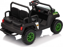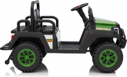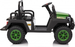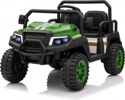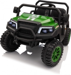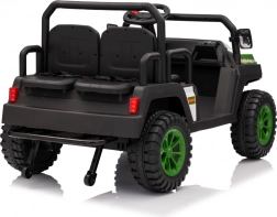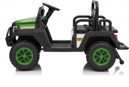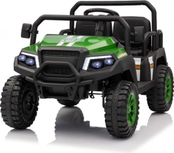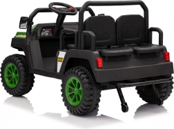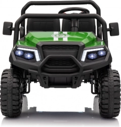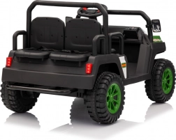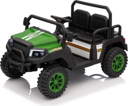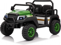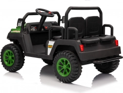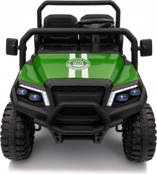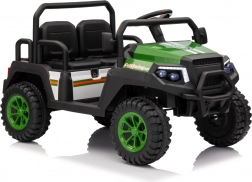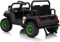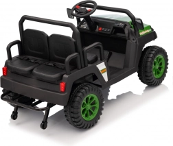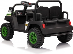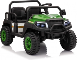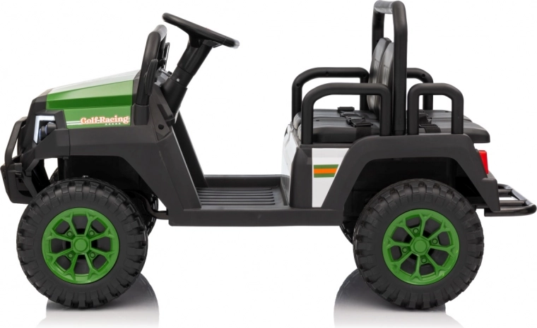 Robuuste elektrische kinderbuggy voor 4 personen CHAMPION in het groen met een krachtig 24V-systeem, 2×200 W motoren, grote EVA-wielen 29×12 cm en vering voor en achter voor comfortabel rijden. De veiligheidsgordels en een 2,4 GHz afstandsbediening met Stop-knop zorgen voor veiligheid, terwijl FM/MP3/Bluetooth/USB en LED-verlichting voor plezier zorgen.