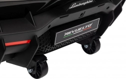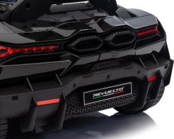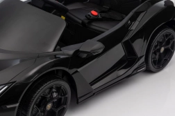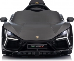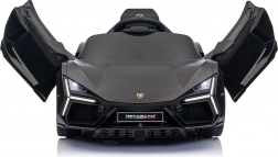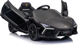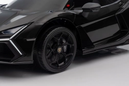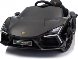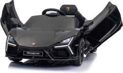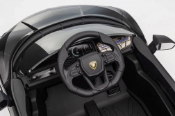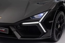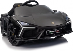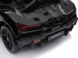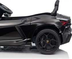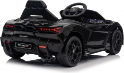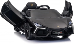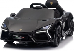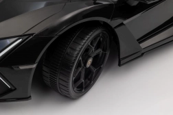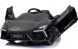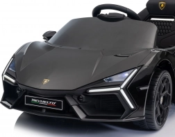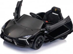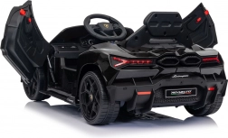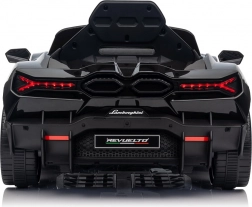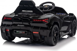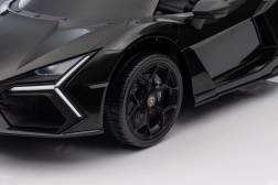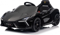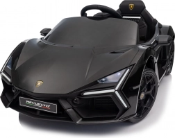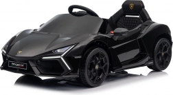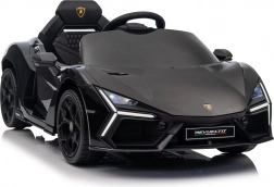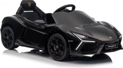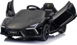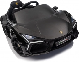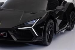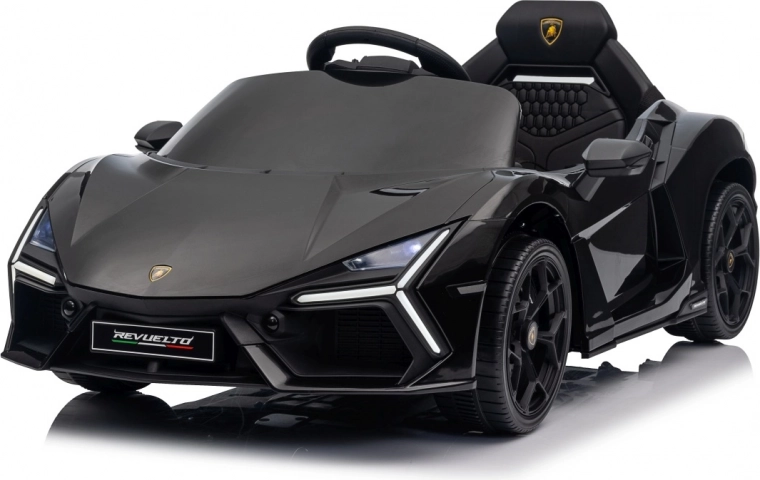 De gelicentieerde elektrische kinderauto LAMBORGHINI Revuelto in elegante zwarte kleur biedt de realistische looks en uitrusting van een echte supercar. Dankzij de 12 V 9 Ah accu en twee motoren (2× 45 W of 2× 35 W afhankelijk van batch) genieten kinderen van een soepele rit vooruit en achteruit met soft start, terwijl ouders alles onder controle houden via de 2,4 GHz afstandsbediening met 3 snelheden en een noodknop Stop.