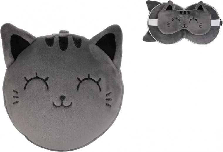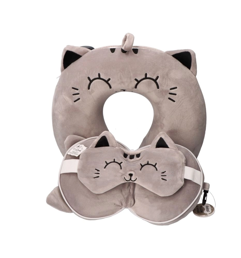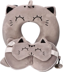 Geniet van een rustige slaap onderweg dankzij het zachte reiskussen met een schattig masker van een grijze kat. De ergonomische vorm helpt de nekwervelkolom te ontlasten en het slaapmasker blokkeert effectief licht voor ongestoorde rust.