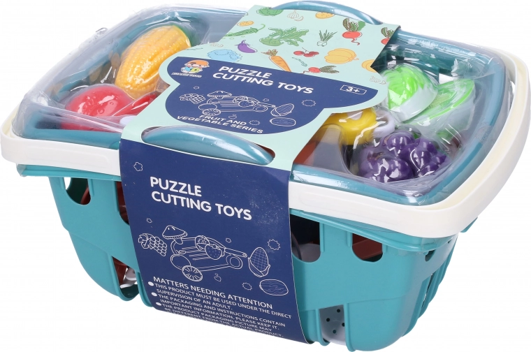 Een leuke keukenset voor kinderen in een mandje in het blauw die kleine koks en kokkinnen zal verblijden. Bevat deelbaar fruit en groenten, een kinderveilig mes en overig servies om koken na te spelen. Het compacte mandje 26 × 19 × 14 cm maakt opbergen en meenemen eenvoudig.