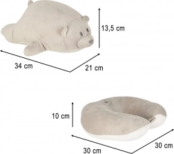 Dit praktische 2-in-1 reiskussen is ideaal voor kinderen en volwassenen die comfort zoeken tijdens het reizen. Het kussen verandert moeiteloos in een pluchen beertje waarmee het heerlijk knuffelen is. Biedt uitstekende steun voor nek en hoofd dankzij de ergonomische vorm en de lichte vulling van polystyreenbolletjes.