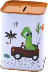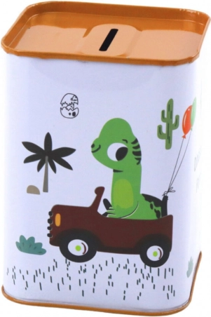 Vrolijke illustraties van een dinosaurus in een auto en kleurrijke afwerking maken van de spaarpot ook een mooie decoratie.