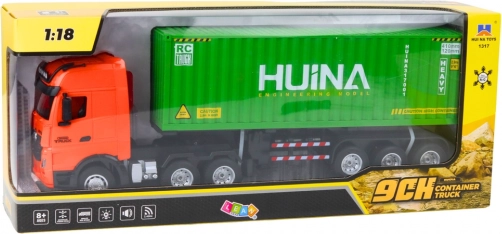 Realistische RC-vrachtwagen met container in schaal 1:18 biedt kinderen en modelliefhebbers geweldig speelplezier. Heeft lichten en geluiden, een openbare en afneembare container, rubberen banden en een stabiele constructie. De ergonomische controller en de demo-rijmodus versterken de beleving alsof je een echte trekker bestuurt.