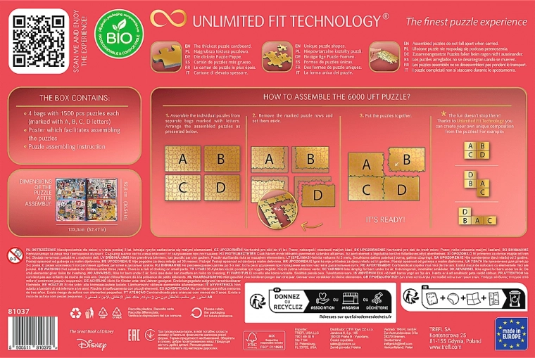 Stel de magische wereld van DISNEY samen met de unieke TREFL UFT puzzel met in totaal 6000 stukjes. De verpakking bevat vier afzonderlijke afbeeldingen van elk 1500 stukjes, die je dankzij de Unlimited Fit Technology (UFT) naar wens kunt verbinden tot één groot geheel. Geniet van de hoogste afdrukkwaliteit, stevige blauwe kartonnen stukjes, makkelijk verplaatsen van samengestelde delen en eco-verpakking zonder plastic folie.
