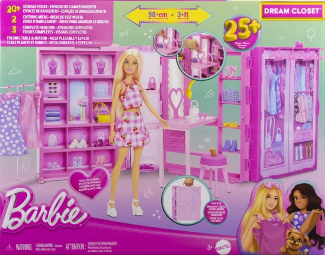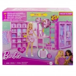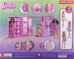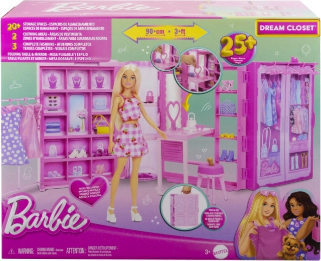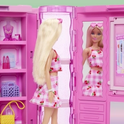 Open de Barbie Droomgarderobe 3.0 en creëer eindeloze verhalen en outfits! De glinsterende roze kast bevat meer dan 25 kledingstukken en accessoires, meer dan 20 opbergvakken, 2 uittrekbare kledingstangen, een grote spiegel, een uitklapbare kaptafel met hartvormige spiegel en een plankje voor schoentjes. Inclusief een Barbie-pop en een schattige hond met kussentje – alles past makkelijk terug in de garderobe met roze handvat voor comfortabel meenemen.