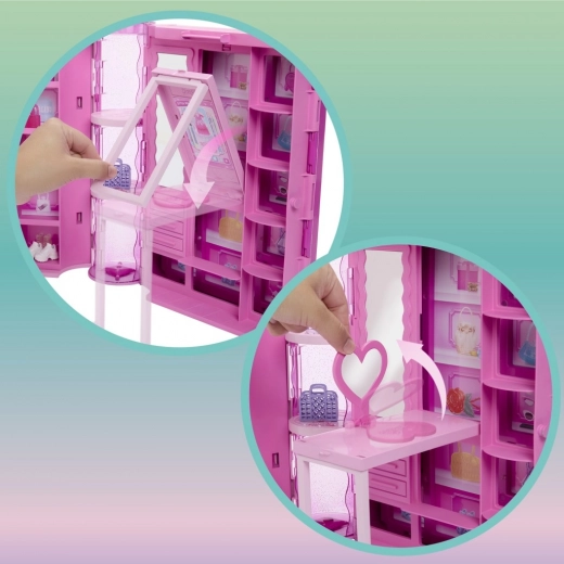 Na het openen ontvouwt de kast zich tot een speelruimte van meer dan 90 cm breed met meer dan 20 vakken, 2 uittrekbare stangen voor hangertjes en een schoenenplank. Laat Barbie een outfit van de hanger kiezen, accessoires bij de spiegel afstemmen en zich klaarmaken aan de kaptafel – daarna kunnen jullie samen met het hondje op nieuwe avonturen gaan. Opruimen is eenvoudig: alle onderdelen passen terug in de kast met een roze handgreep voor transport.