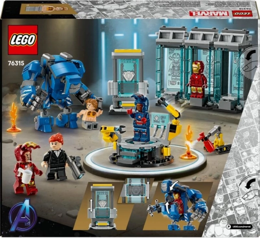 Bouw de iconische IRON MAN-pantserkamer met transparante blauwe capsules waarin drie beroemde pakken schitteren. Voor actie zorgt de articuleerbare Igor MK3-mech met cockpit voor een minifiguur, een duo robotarmen op het serviceplatform en een scanner voor diagnose. De set is ideaal om filmscènes na te spelen en stijlvol neer te zetten.