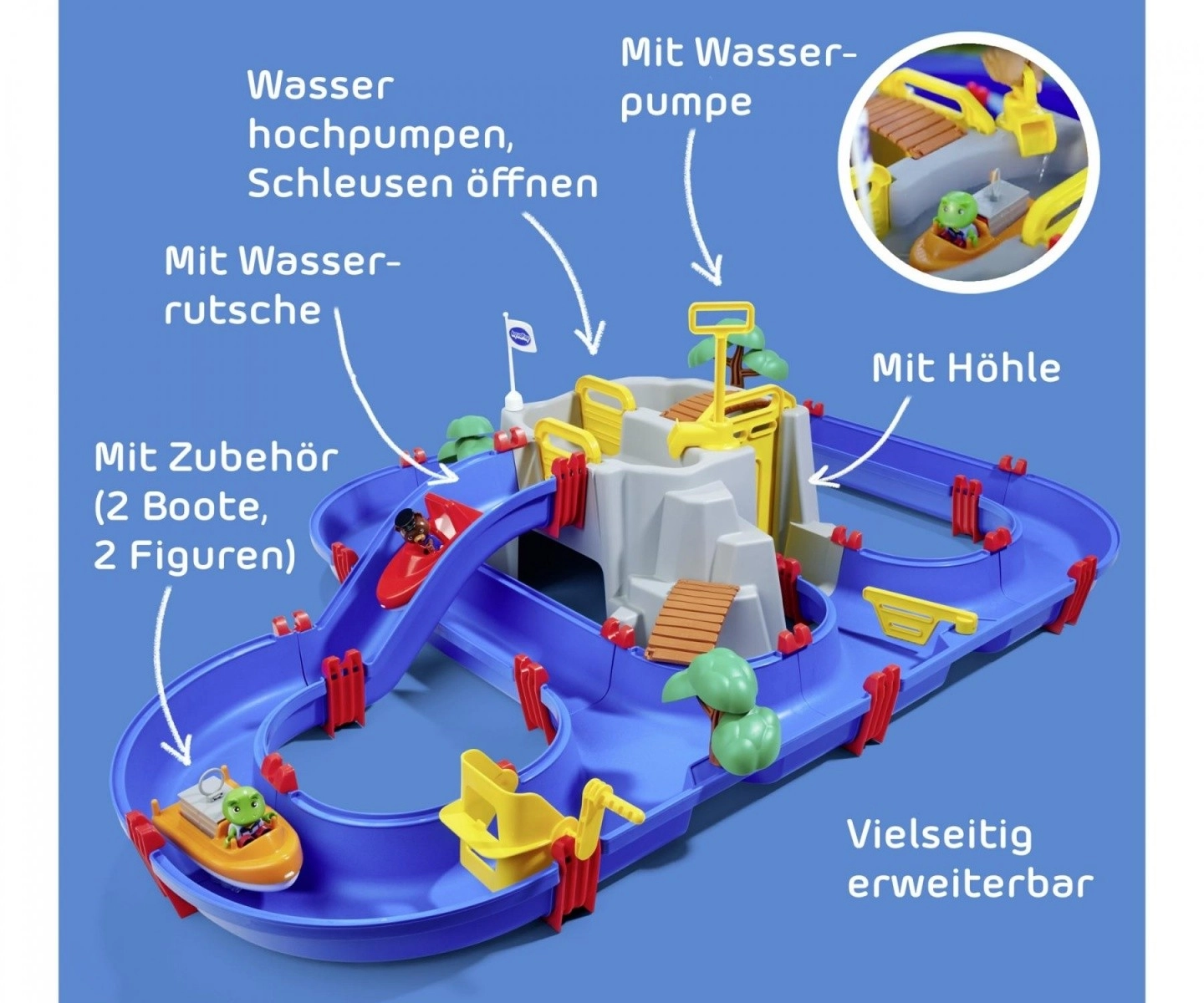 Geniet van speelplezier met de waterbaan AquaPlay MountainLake. Deze unieke set bevat 69 onderdelen, waaronder 2 boten en 3 figuurtjes, een grote grot en een waterval.
