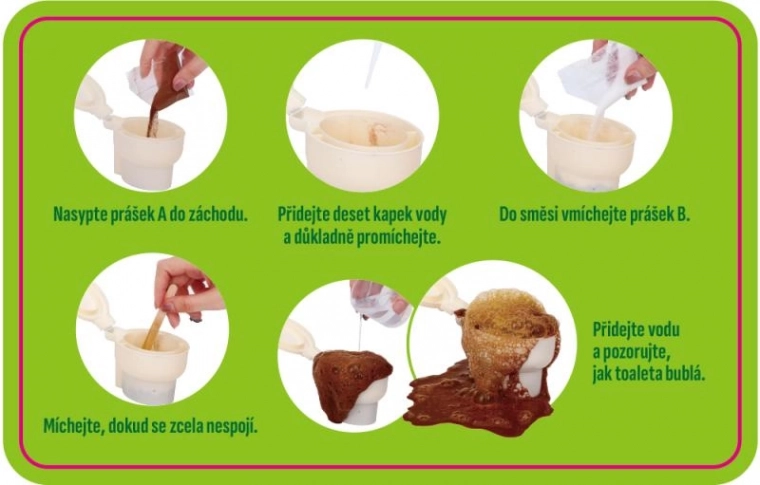 Glumi slijm – wc-explosie. Meng het poeder met water en geniet van een spectaculair geiser-effect. Eenvoudige voorbereiding, geweldig partyspel voor kinderen en volwassenen.