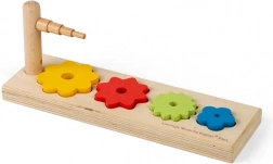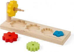 Deze houten inlegpuzzel combineert insteken en stapelen in één leuke activiteit. Vier gekleurde bloemen worden gesorteerd op grootte en vorm, wat op natuurlijke wijze de ontwikkeling van cognitieve vaardigheden en ruimtelijk inzicht ondersteunt. Kinderen oefenen greep, precisie en geduld bij het correct plaatsen van de afzonderlijke stukken.