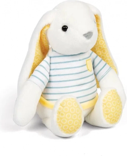Schattig en zacht pluchen konijn met lange oren, een blauw gestreept T‑shirt en geelgepatroneerde voetjes – de ideale speelkameraad voor zowel spelen als slapen. Gemaakt van gerecyclede materialen met GRS‑certificering, voldoet aan de Europese veiligheidsnormen en is geschikt vanaf de geboorte.