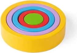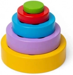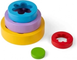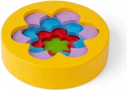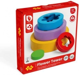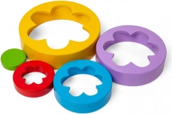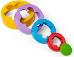 Vijf onderdelen in verschillende formaten maken het mogelijk om een toren te bouwen of kleurrijke bloempatronen te vormen. Kinderen leren spelenderwijs kleuren en het onderscheiden van maten.