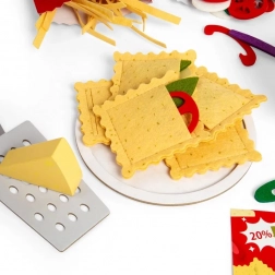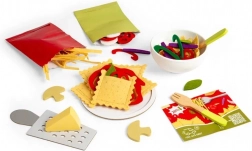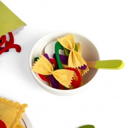 Met deze veelzijdige set spelen kinderen kleine chef-kok en bereiden ze hun eigen pastabord. Kleurrijke, zachte vilten ingrediënten zoals tagliatelle, ravioli en farfalle worden aangevuld met tomatensaus, champignons, basilicumblaadjes en daarbij een houten kom, bord, twee vorken en een rasp met een plak Parmezaan – alles voor realistisch kookplezier.
