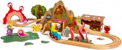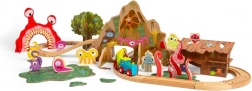 - Locomotief, 2 wagonnetjes, rails, brug, tunnel, monsterfiguren, boom met dieren, moeras, hut en accessoires